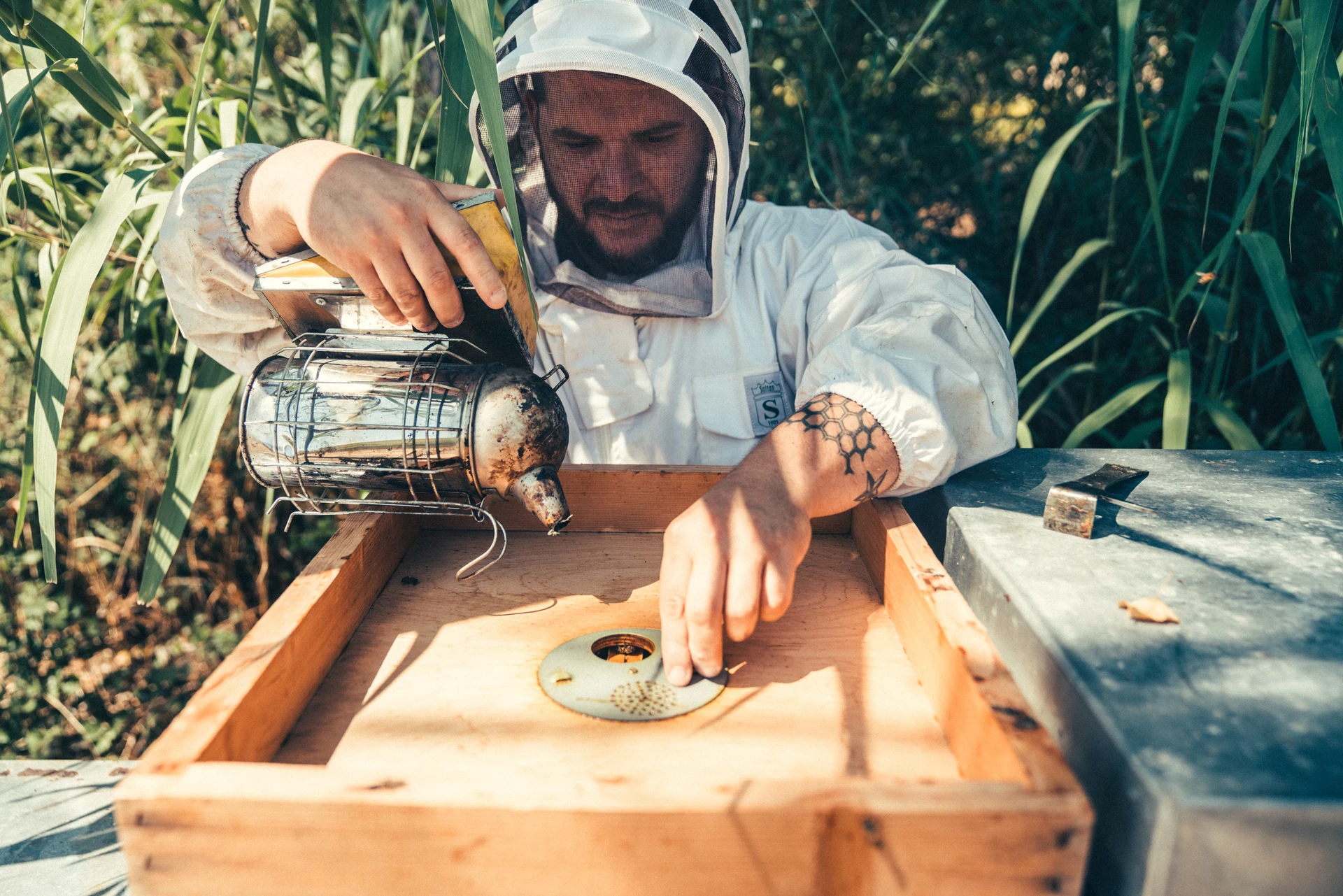 Alleviamo api come si faceva 200 anni fa. Con la stessa attrezzatura. Un affumicatore, una leva di acciaio, una maschera per evitare le punture. Non potremmo mai fare nulla di diverso da questo.