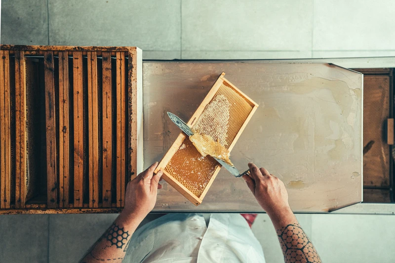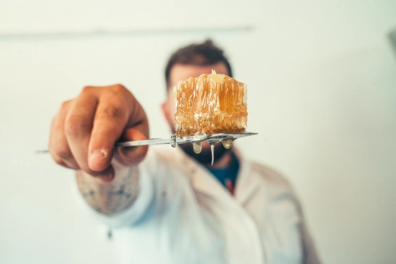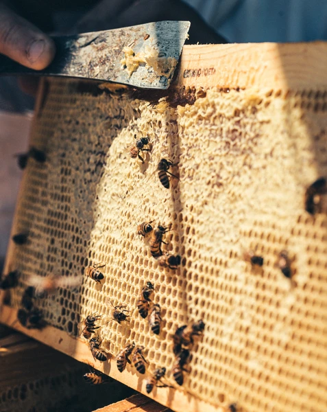 Una volta immagazzinato il miele dalle api nei favi, composti da legno e cera, questi vengono portati in laboratorio e “smielati”. La smielatura consiste nell’estrazione per centrifuga del miele contenuto all’interno dei favi. Una volta effettuata questa smielatura, il miele viene successivamente filtrato con un filtro a maglie fine e lasciato riposare in tank di acciaio fino alla sua maturazione, ovvero fino a quando l’aria che ha inglobato durante questi processi viene espulsa in maniera naturale.